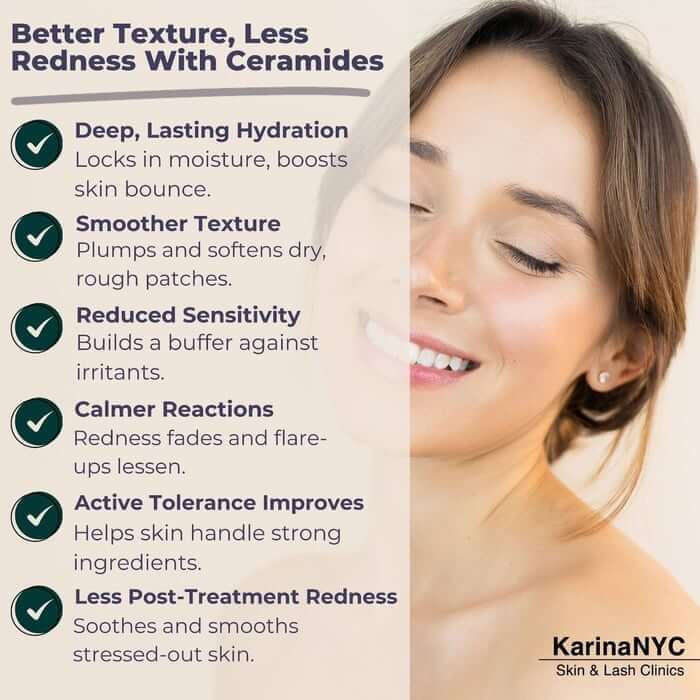 If you’ve just had a peel, microneedling, or laser, or even just overdid it on exfoliants, ceramides help speed up recovery. They calm visible inflammation, reduce surface peeling, and protect the skin as it rebuilds.