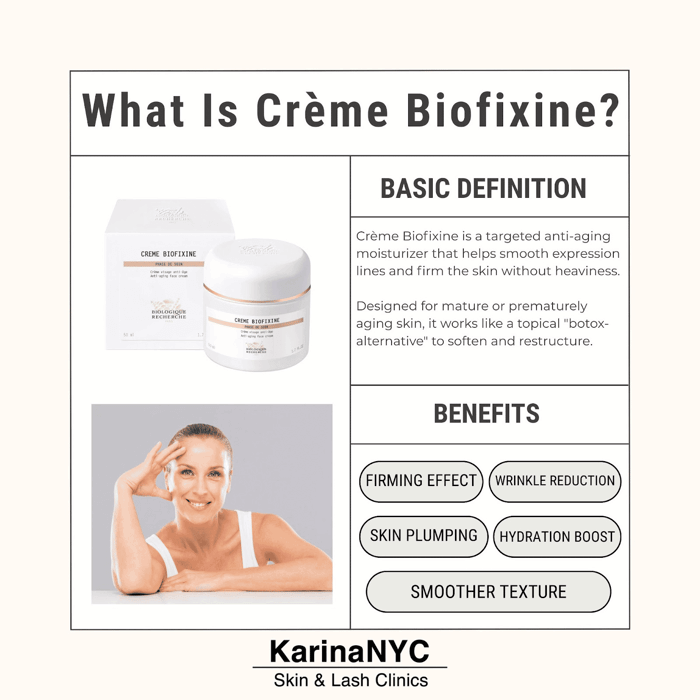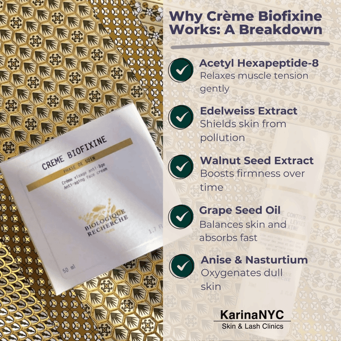 At Karina NYC, we’ve spent 25+ years helping our clients age beautifully, using advanced French skincare that respects the skin’s integrity. Biofixine isn’t just a product we sell, it’s a core part of how we treat expression lines without compromising your face or your values.