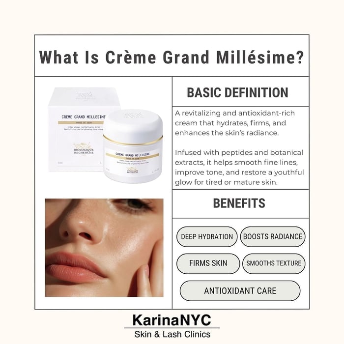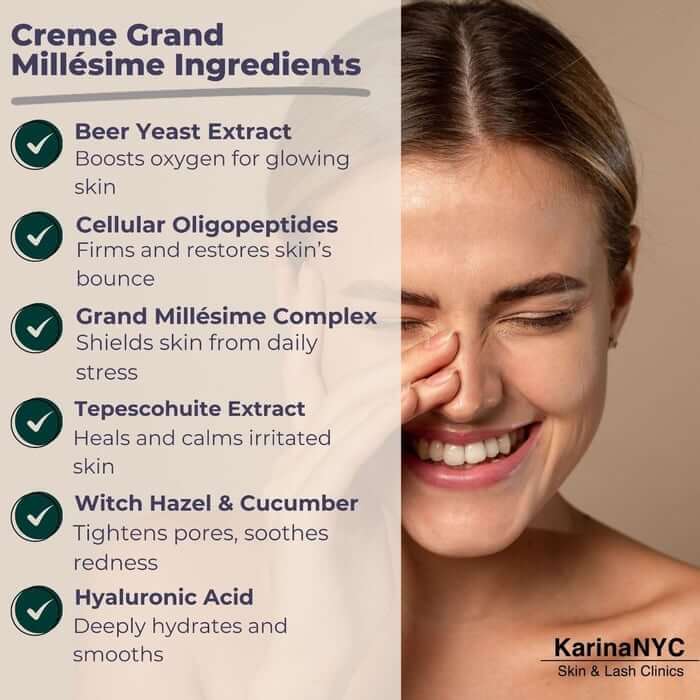 Creme Grand Millesime was designed precisely for this moment. At KarinaNYC, we guide clients through ingredient-rich regimens that actually work, not based on hype, but results.