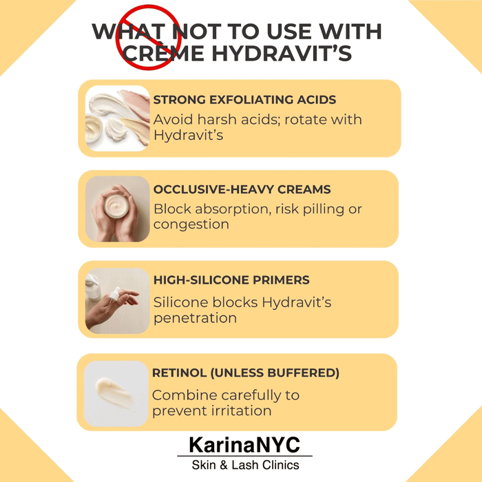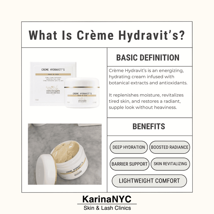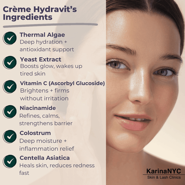 At KarinaNYC, we guide clients to understand what their skin truly needs, not just what’s trending. In this guide, we break down the ingredients of Crème Hydravit’s and help you decide if it’s the right fit.