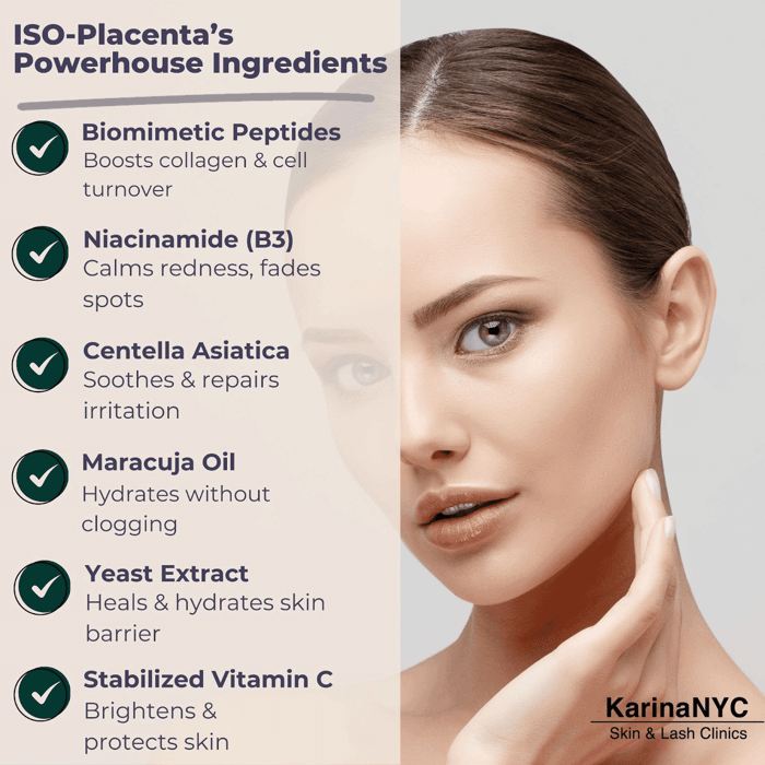 A product is only as good as its ingredients. And Crème ISO-Placenta? It’s stacked with smart, skin-repairing actives that work with your skin, not against it. Here’s what makes it special: