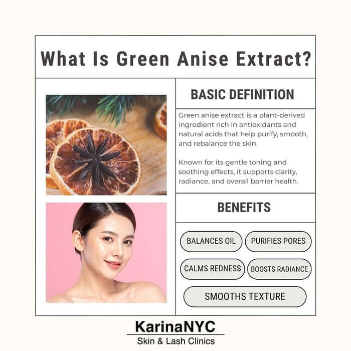 What sets green anise apart is how it's extracted. We only work with versions processed using a water/glycerin method, no harsh solvents, which keeps the actives potent and skin-friendly. We store it cold at KarinaNYC to maintain stability and performance.