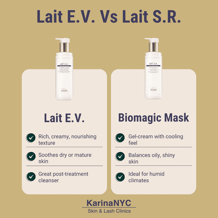 Lait E.V. is ideal for dry, mature, or dehydrated skin; Lait S.R. works best for oily, congested, or combination skin.