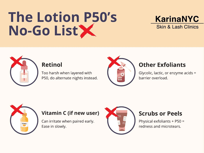 Physical scrubs and chemical peels don’t belong in the same routine as P50. Overlapping exfoliants strips your barrier and increases sensitivity. If you're using P50, skip the extras, it's strong enough on its own.