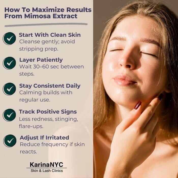 For sensitive skin, avoid aggressive preparation. Skip harsh scrubs or strong acids before applying mimosa-containing products. Your skin should feel clean but not tight or irritated.