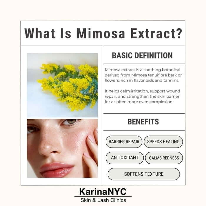 Mimosa extract soothes sensitive skin through powerful anti-inflammatory compounds called tannins and flavonoids that calm reactivity and strengthen compromised barriers. This botanical ingredient reduces redness and irritation while supporting your skin's natural healing process.