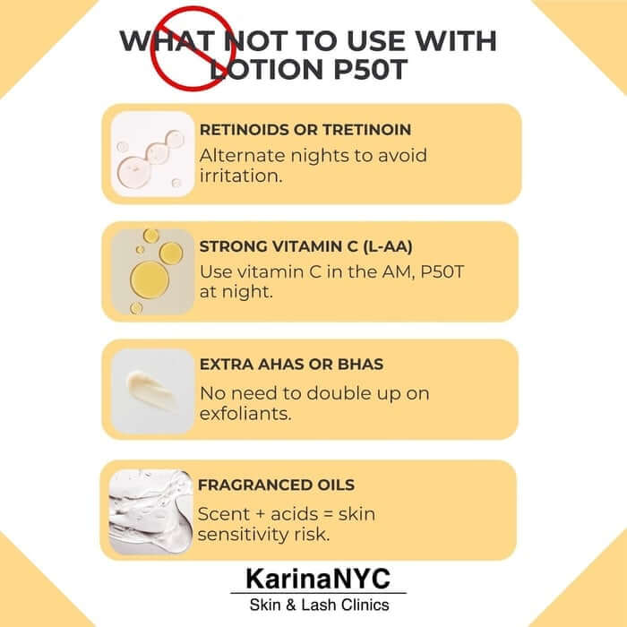 Lotion P50T already contains lactic acid, citric acid, gluconolactone, and sodium salicylate. Adding a second exfoliating serum or acid toner is like putting your skin on double time, and it usually backfires. More isn’t better.