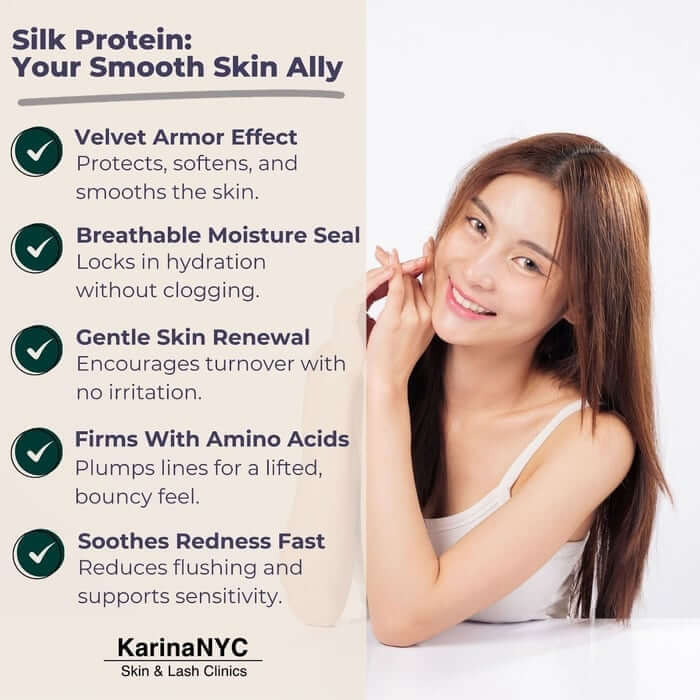 If you’re nodding, you’re exactly who I recommend silk protein for. At KarinaNYC, we use silk-based serums and masks daily for clients dealing with: