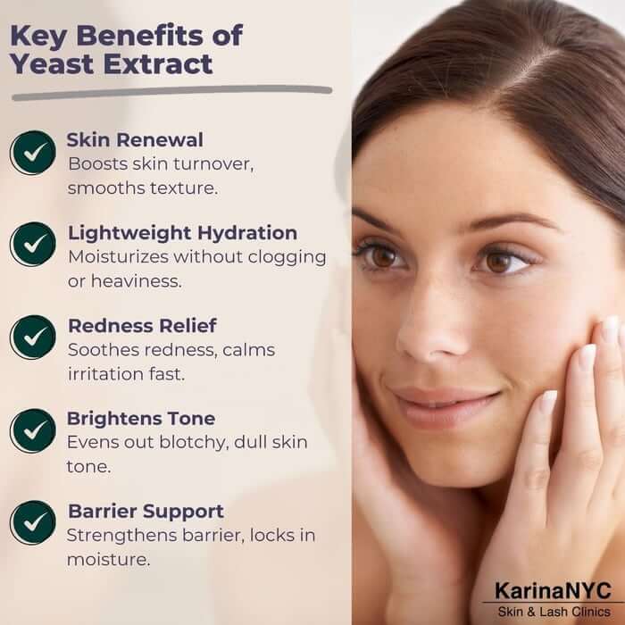 - It supports the skin barrier. We see this all the time in the studio: compromised barriers from over-exfoliation, stress, or travel. Yeast extract helps rebuild what’s been broken down by boosting lipid synthesis and cellular regeneration.
